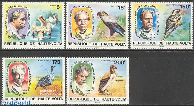 In what would have been Schweitzer’s centenary year the Republic of Upper Volta produced the above beautiful stamp set depicting the following fauna native to Africa: 5f Great White Pelican (Pelecanus onocrotalus), 15f Bateleur Eagle (Terathopius ecaudatus), 150f Tanzanian Red-billed Hornbill (Tockus erythrorhynchus), 175f Vulturine Guineafowl (Acryllium vultur), 200f King Vulture (Sarcoramphus papa).