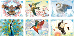 As birds by their very nature are migratory and representative of countries all around the world, six species which can be sighted in Jersey feature on the stamps above, together with the traditional symbolic meaning with which they are associated. The birds and what they represent are, top left to right: The Kestrel (Vision and patience), Swallow (Hope and renewal), Swan (Purity and love). And bottom left to right: Peacock (Glory and dignity), Kingfisher (Peace and calm) andStork (New beginnings and commitment). If the swan and kingfisher stamps are scanned with a mobile phone, using the free CEE-App, you will be able to hear the bird sounds.