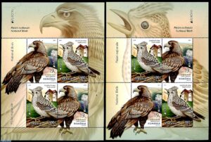 The two stamps of the Romanian postage stamps issue illustrate the Golden Eagle (Aquila chrysaetos) and the Eurasian Skylark (Alauda arvensis).
