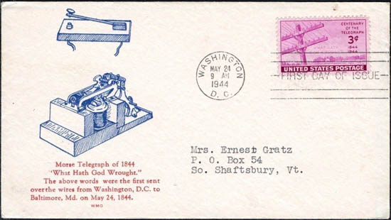 Above is a U.S. first day cover envelopes with stamp from 1944, commemorating the first telegraphic message sent in America and depict Samuel Morse his Morse Code machine.