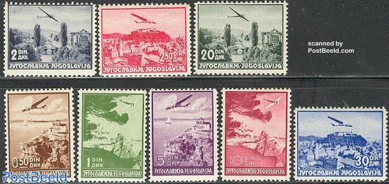 These 1937 airmails were also produced to promote tourism. The 0.50 and the 5 Dinar show the 10th Century Monastery of St. Naum (now in Macedonia). The 1 and 10 Din. have the Port of Rab (now Croatia). A view of Sarajevo (now Bosnia and Herzegovina) on the 2 and 20 Din. On the 2.5 and 30 Din. is an aircraft flying above Ljubljana (now Slovenia).