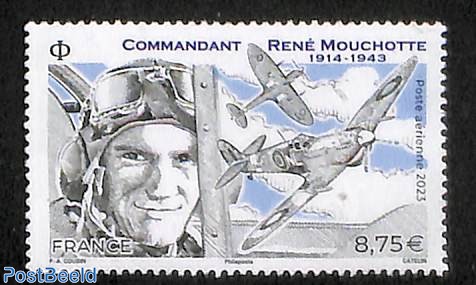 Commander René Mouchotte (1914-1943), French fighter pilot of the Second World War, is commemorated on this airmail stamp. August 27, 2023 was the 80th anniversary of Commandant René Mouchotte’s death. A highly capable pilot and leader, Mouchotte was the first non-Commonwealth aviator to command an RAF squadron. The stamp shows a portrait of René Mouchotte with, to his right, two views of the Spitfire, his emblematic plane, with its roundel of Britain’s Royal Air Force. René Mouchotte also had the Cross of Lorraine badge (badge of the Free French Air Force) painted on his plane. He was one of the most famous and admired French fighter pilots of World War II. Mouchotte’s final posting was to 341 Free French Squadron at RAF Biggin Hill. While commanding 341 Squadron, he was shot down and killed in combat with a Focke Wulf 190 on the first daylight raid to Blockhaus d’Éperlecques in the Pas de Calais, France, on August 27, 1943.