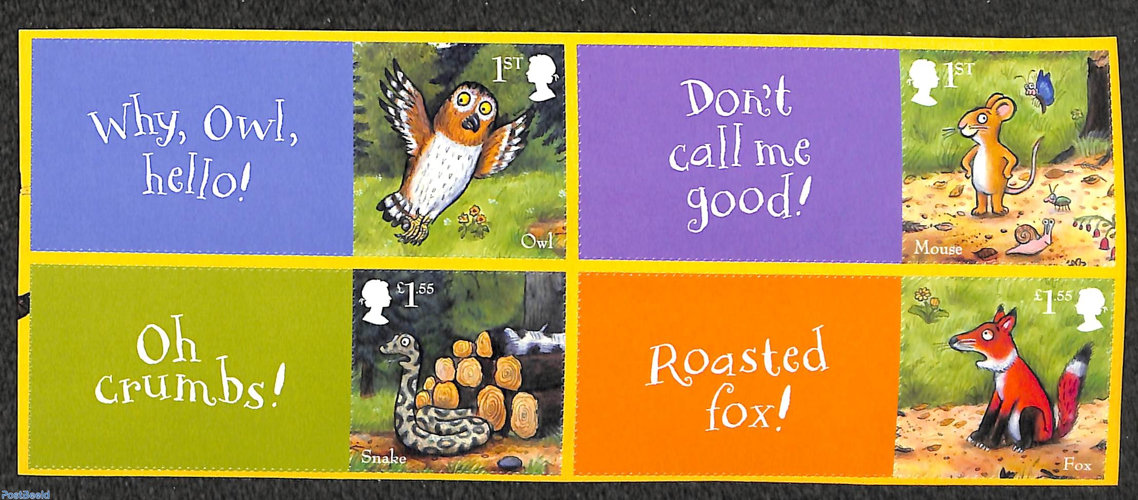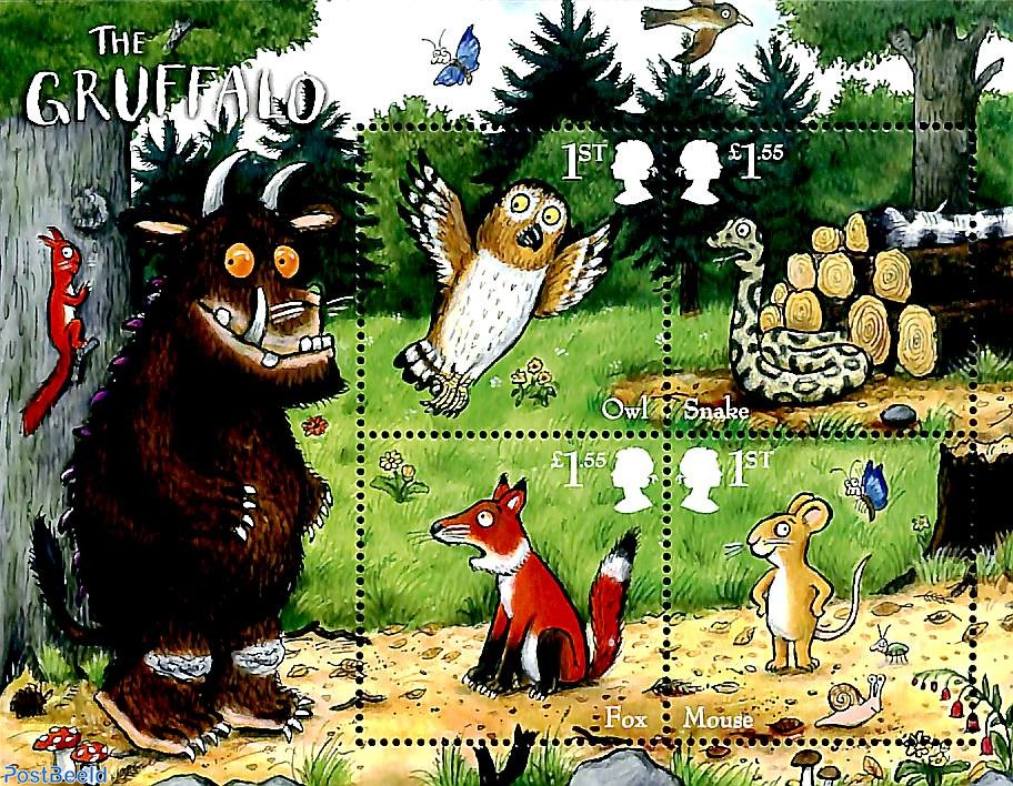 A Miniature Sheet features Fox, Owl, Snake and Mouse encountering The Gruffalo in new artwork created by the story’s illustrator Axel Scheffler.
