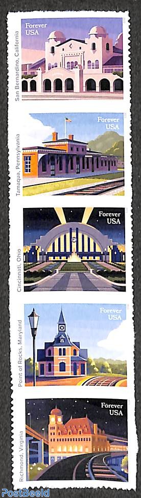 This beautiful stamp sheet, produced by the United States Postal Service, was issued in March 2023. It features five historic railway stations, still in existence in the United States, on a sheet of 20 stamps. The designs were digitally painted with the aim of highlighting the deep history and complex architecture of each station. The company engaged by the USPS, Down The Street Designs, created the superb Art Deco-themed artwork for the stamps.