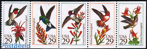 Produced by the United States in 1992 and seen here, left to right, we see a Ruby Throated Hummingbird; a Broad-Billed Hummingbird; Costa’s Hummingbird; a Rufous Hummingbird, which summers as far north as Alaska. Its migration is one of the longest of all birds as it winters in Mexico – a distance of almost 6,400 kilometers; and a Calliope Hummingbird, which is the smallest bird in North America.