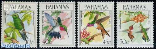 Four hummingbird stamps issued by Bahamas in 1989: 10c Cuban emerald, 40c Ruby-throated, 45c Bahama Woodstar, 50c Rufous hummingbird.