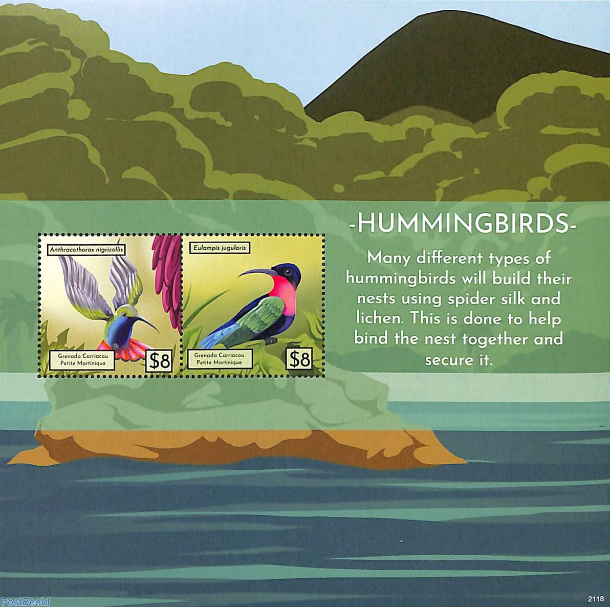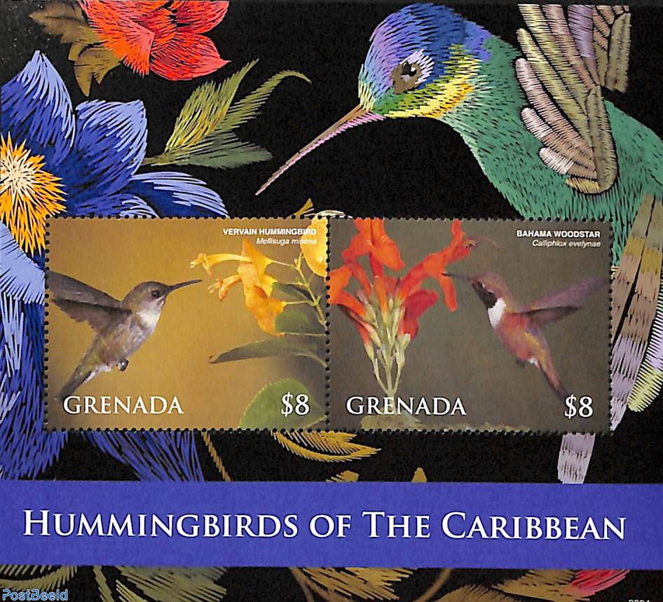 Two beautiful stamp sheets from 2023 issued by Grenada. Above a black-throated mango hummingbird (Anthracothorax nigricollis) and a purple-throated carib (Eulampis jugularis), and the sheet below has the vervain hummingbird (Mellisuga minima) and a Bahama woodstar (Calliphlox evelynae).
