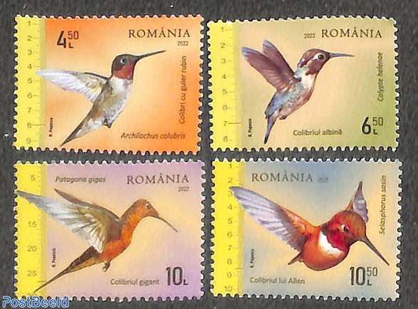 The 2022 Romania hummingbird issue has a unique feature – a centimeter ruler on the left of the stamp indicating the size of each bird. A ruby-throated hummingbird (Archilochus colubris) is depicted on the 4.50 Lei stamp; a bee hummingbird (Calypte helenae), seen on the 6.50 Lei stamp, is an endemic species of the Cuban archipelago – the bee hummingbird is the world’s smallest bird; in contrast the giant hummingbird (Pantagona gigas), illustrated on the 10L stamp is the largest of the species. The 10.50L Allen’s hummingbird (Selasphorus sasin), is one of the seven species of the genus Selasphorus.
