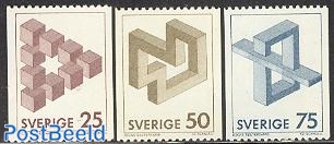 What do we see when we look at the drawing on the stamp from Austria (1981) above? Several artists, notably the Dutch ‘master of optical illusion’ Maurits Escher, have incorporated into their designs certain impossible features that cannot exist in three-dimensional space. These include the ‘impossible cube’ on the stamp above, inspired by his designs and the ‘impossible triangle’ by the Swedish artist Oscar Reutersvärd, shown on the first of the three stamps from Sweden (1982) in the continuation of this article.