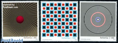 In 2010 the Swiss Post Office issued a set of three optical art stamps, designed by Youri Messen-Jaschin, an artist of Latvian origin who was born in Switzerland. They feature a red sphere with a background of intersecting spirals, a pattern of coloured squares, and a dramatic arrangement of mainly black-and-white concentric circles and vertical lines. The designs are arranged to give the illusion of movement.