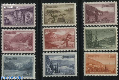 These definitives issued in 1959, depict various lakes, rivers and mountains to be found in the Soviet Union. Lake Baikal is featured on the 40 Kopeck stamp.