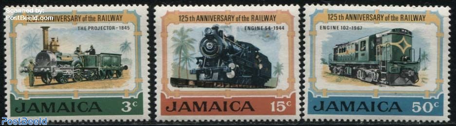 The first railway in Jamaica, the Western Jamaica Connecting Railway, was built in 1845 from Kingston to Angels (23.3 kilometres) near Spanish Town. The railway was proposed and started by Englishman William Smith. The stamp on the left shows The Projector (1845) – one of two locomotives used on the line, the other being Patriot. The middle stamp has Engine 54 from 1944 and on the right is diesel-engine 102 from 1967. The stamps from 1970 celebrate the 125th anniversary of the introduction of the railway in Jamaica.