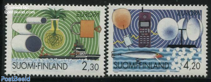 Two stamps from 1994 featuring successful Finnish industries. The 2,30 stamp features wood processing – the production of a wide range of products from planks to pulp and paper, a major sector of industry in Finland; an important discovery by Artturi Ilmari Virtanen (1895-1973) who in 1945 became a Nobel Prize laureate in chemistry for his research and inventions in agricultural and nutrition chemistry; Assa Abloy – a global leader in the manufacture of locks and locking systems; Finland was also once famous as a builder of ice-breakers, vessels needed by Finland’s ports every winter to clear shipping lanes through the sea ice seen here is the ice breaker MS Fennica. The stamp on the right features a Vaisala radiosonde – an electronic device that is used to measure meteorological variables in the atmosphere; the Rapala fishing lure; the mobile phone developed in the late ’70s by Nokia and television manufacturer Salora – in the 1980s Salora was incorporated into Nokia and as an indication of the progress made by the late ’80s, Soviet leader Mikhail Gorbachev was famously pictured using the latest handheld Nokia mobile phone to contact the Kremlin while on a visit to Helsinki in 1987; top right of the stamp is a wind power plant.