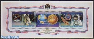 In 1979 Samoa issued the above anniversary stamp sheet. The stamp shows the recovery operation of the spaceship Columbia. The helicopter from the USS Hornet aircraft carrier is shown hoisting Neil Armstrong from the liferaft.