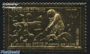 Chad produced this embossed gold foil stamp in 1969 showing rock samples being collected.
