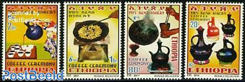 Stamps from Ethiopia 2011 entitled ‘Coffee Ceremony’, showing the cooking and crushing of the coffee beans and pouring of the coffee. the stamp far right shows traditional coffee pots.