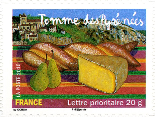 The cheese depicted on the above stamp comes from Occitanie. It is a hard cheese usually covered with a thin black skin. It was once made only by small farmers in the Pyrenees for their own consumption and could be made from three different kinds of milk: cow, goat and ewe. First-known mention in the 12th Century.