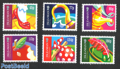The six stamps recall familiar shows which have been staged in the Isle of Man over the years. In order of value the stamps show The Wizard of Oz (the red shoe of Dorothy), Peter Pan (Captain Hook), Aladdin (the lamp), Snow White (the poisoned apple), Dick Whittington (stick with cloth sack) and Robin Hood (his feathered hat).