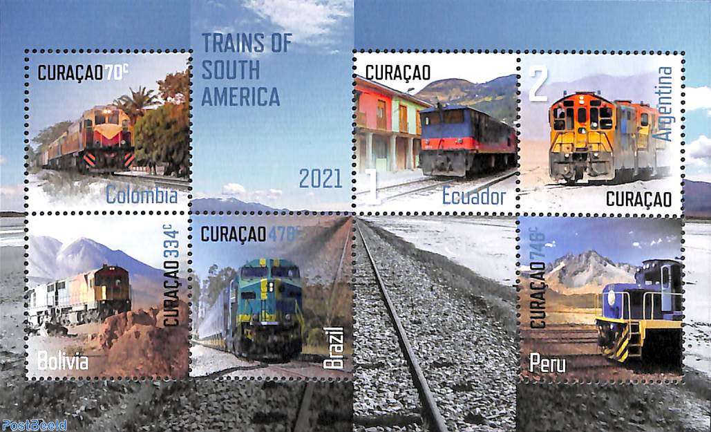 This fine ‘Trains of South America’ set produced by Curacao in 2021 shows the following: