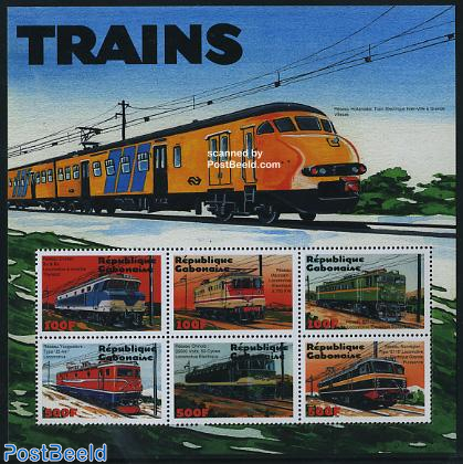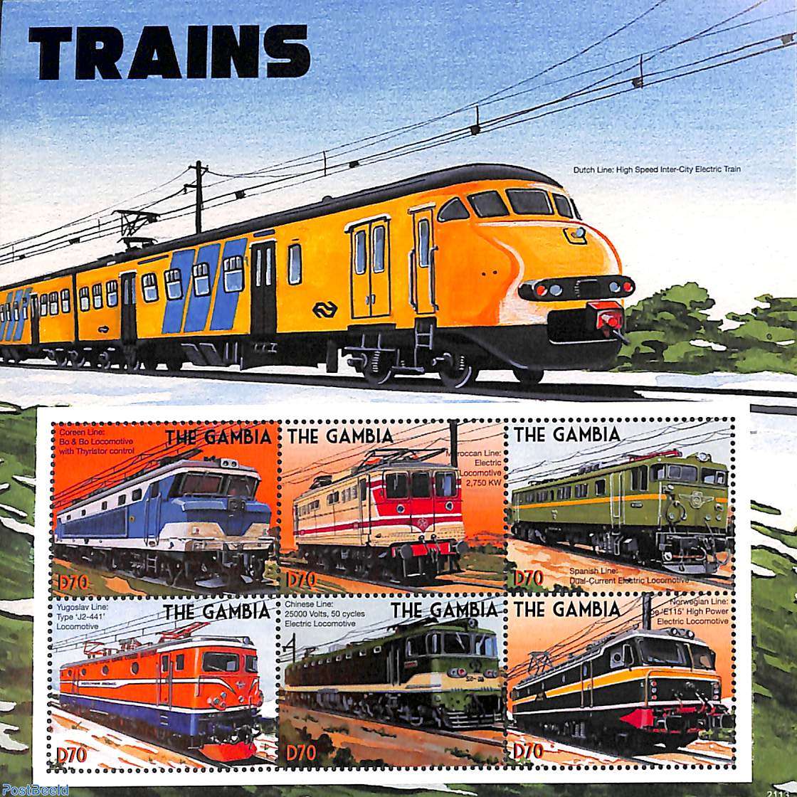 Stamp minisheet 2021 from The Gambia with electric trains from various countries. In the border is a Dutch Nederlandse Spoorwegen Plan V train from 1964.