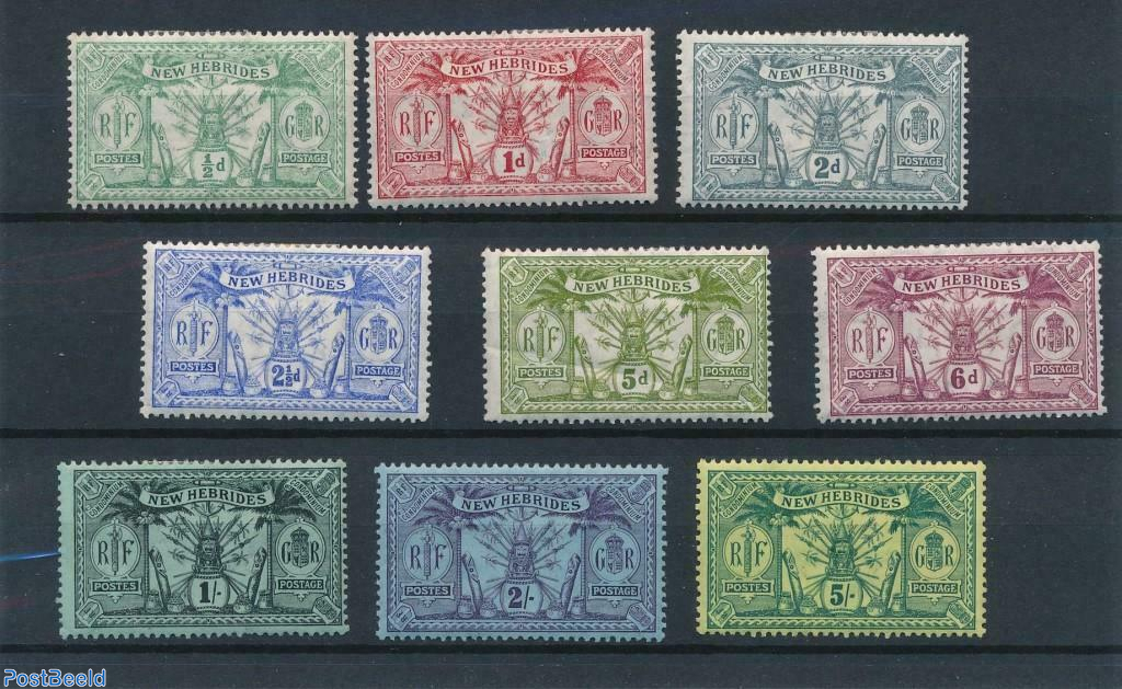 The stamps above and below from New Hebrides are joint issues from 1911 when a specific new design was introduced, being denominated in both British and French currencies and featuring the coats of arms of both countries.