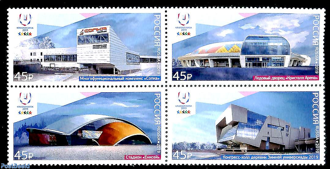 The Russian city of Krasnoyarsk in Siberia hosted the 29th Winter World University Games. Here we have a stamp set featuring the architecture of some of the event’s locations. Top left is the Sopka sports complex, top right is the Crystal Arena ice rink. The bottom pair are the Yenisei stadium and the Winter Games’ Congress Hall.