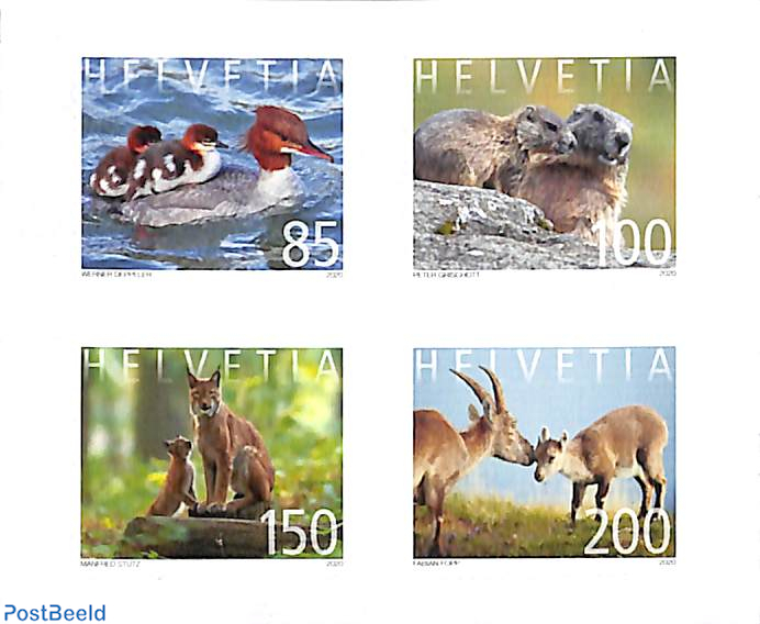 Below is a set of 4 self-adhesive values titled “Animal Families” featuring a Goosander and two fledglings (85) then
