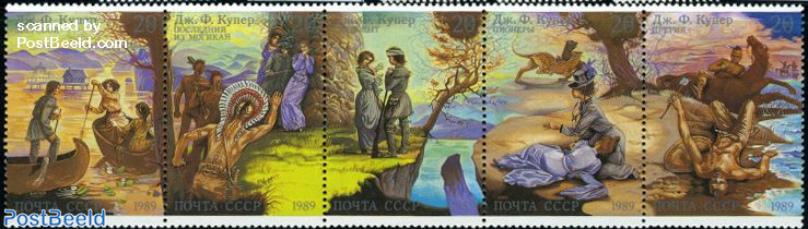 “The Last of the Mohicans: A Narrative of 1757”, was the second and probably most popular novel of the “Leatherstocking Tales” five-book series by American writer James Fenimore Cooper (1789-1851). Colourful scenes from the five books were depicted on these beautifully-illustrated stamps produced by the Soviet Union in 1989, the bicentenary of the birth of J. F. Cooper.