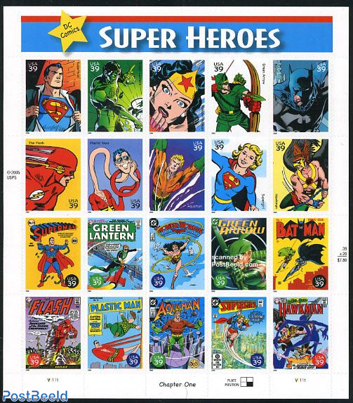 We have many additions from the U.S.A. Above is a 20-stamp DC Comics Super Heroes mini-sheet from 2006 …