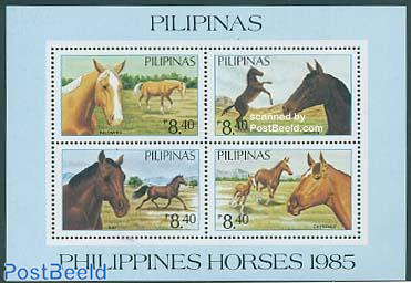 A fine stamp Philippines stamp sheet from 1985 featuring horse breeds Palomino, Brown, Bay and Chestnut.