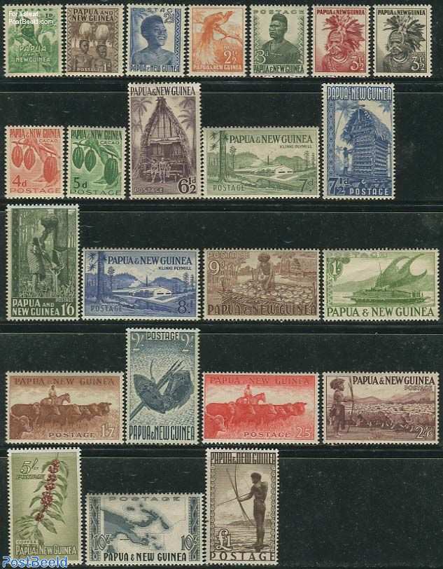 Finally, a wonderful set of definitives from Papua New Guinea, issued in 1952 with various topics pictured on the 23 stamps.