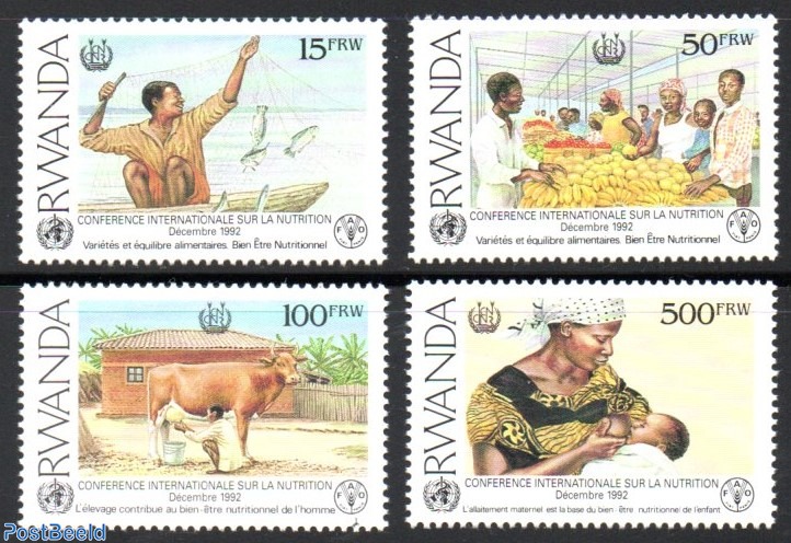 In December 1992, delegates from 159 countries and the European Economic Community and representatives from 144 Non-Governmental Organizations (NGOs – independent non-profit groups), 11 inter-governmental organizations and 16 United Nations bodies attended an International Conference on Nutrition, jointly organized by the Food and Agriculture Organization of the United Nations (FAO) and the World Health Organization, at FAO headquarters in Rome, Italy. The two organizations had co-operated in the past with efforts to overcome the problem of malnutrition. Rwanda produced this stamp set in 1992 to commemorate the initiative.