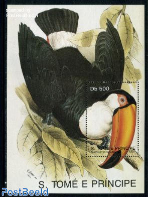 Above, from the Central African island country São Tomé and Príncipe, issued 1991, this wonderfully illustrated stamp sheet featuring a Toucan (Ramphastos toco).