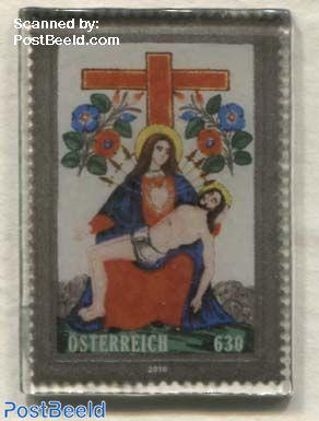 Austrian Post is famous for presenting very special, exclusive stamps and in 2016 produced a glass stamp, the first stamp valid for franking ever made out of glass anywhere in the world. The glass stamp shows one of the famous “Sandlbilder” – a reverse glass painted Pietà from the Upper Austrian municipality of Sandl. The traditional design of the Pietà (also known as a Vesperbild in German) dates back to the 14th century. The stamp shows the Virgin Mary weeping over the dead body of her crucified son, Jesus. In reverse glass painting the design is painted on the back of the glass, enabling the front to be cleaned easily, which was a big advantage in the smoke-filled farmhouse parlours of bygone years. There is a long tradition of reverse glass painting in Sandl. This is because there were many glass works in the nearby Bohemian forests, from which sheets of glass could be acquired easily and cheaply.