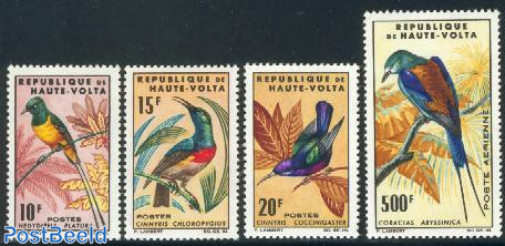 Then back to 1965 from Upper Volta (now known as Burkina Faso), left to right: the Pygmy Sunbird (Hedydipna platura), an Olive-bellied Sunbird (Cinnyris chloropygius), the Splendid Sunbird (Cinnyris coccinigastrus) and an Abyssinian Roller (Coracias abyssinicus).