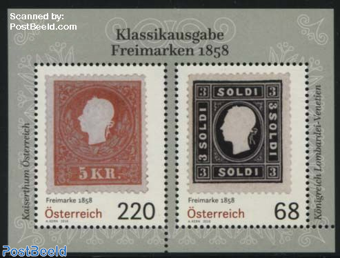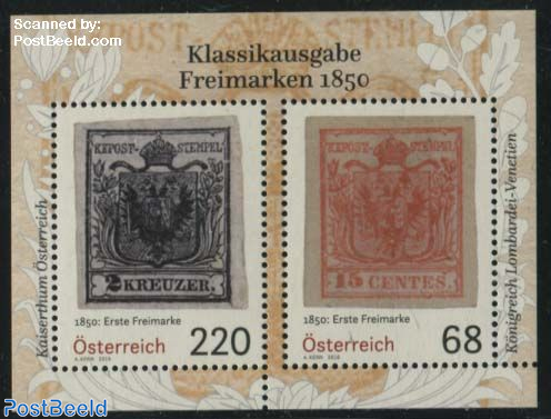 Ten years after the world’s first postage stamp, the Austrian Empire produced its first stamps. They showed the Austrian coat of arms with the double-headed eagle. Values of 1, 2, 3, 6 and 9 Kreuzers were issued. The stamps for the Kingdom of Lombardo-Venetia, which also belonged to the Habsburg Empire, showed the same motif in the same colours but with the denominations of 5, 10, 15, 30 and 45 centesimi – they were valid throughout Austria, while the Austrian was not allowed to be used in Lombardy and Veneto. The first day of issue was June 1, 1850. Initially, the stamps were printed on hand-made paper with sheet watermarks, then from 1854 on machine-made, smooth paper without watermarks. The stamps were not yet perforated, they were cut off the sheet with scissors. Depending on how carefully the stamps were cut off and the different types of paper and printing methods, there are many colour and quality variants of the coat of arms edition. As Austria’s first stamp issue, it is extremely popular with philatelists and collectors today. The stamp block shows the Austrian issue with a value of 2 Kreuzer and an issue from Lombardo-Venetia with a value of 15 centesimi. The background is a 1 Kreuzer stamp, entwined with flowers and oak leaves, as depicted on the stamps. Austria’s first perforated postage stamp was the “Kaiserkopf issue” of 1858, which followed the coat of arms issue. This stamp sheet is also shown below.