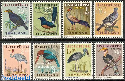 Thailand 1967, from top left: Talking Mynah (Gracula religiosa), White-rumped Shama (Copsychus malabaricus), Diard’s Fireback Pheasant (Lophura diardi), Spotted-necked Dove (Spilopelia chinensis), Sarus Crane (Antigone antigone), White-breasted Kingfisher (Halcyon smyrnensis) and Great Hornbill (Buceros bicornis).