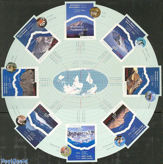 Great stamp sheet issued by Canada in 2002. The stamp sheet has eight stamps showing mountains from different indicated continents. The mountains are (clockwise from the top): Kilimanjaro (Tanzania), Aconcagua (Argentina), Mount McKinley (USA), Mount Logan (Canada), Elbrus (Russia), Puncak Java (Indonesia) and Mount Everest (Nepal/China).