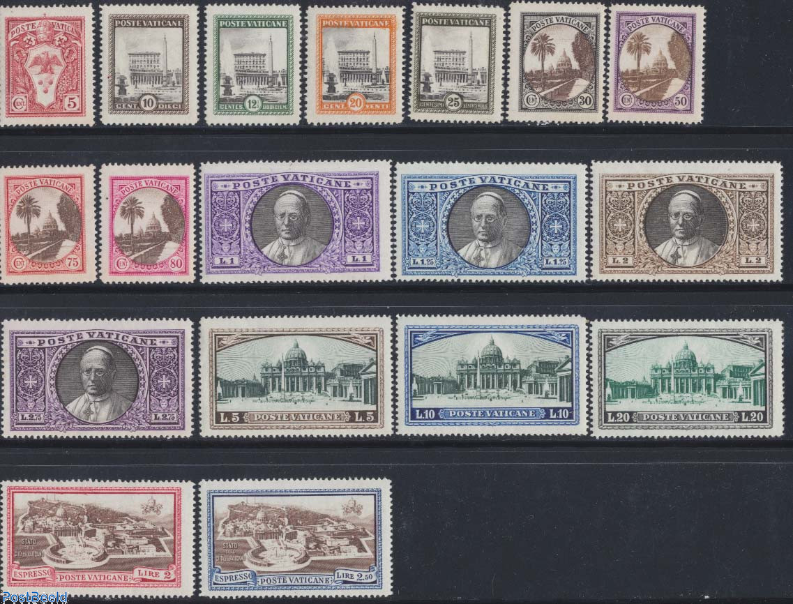 The eighteen stamps above were issued by Vatican City in 1933. The stamps have differing values and designs and there are two special delivery stamps. Four of the stamps feature the Vatican Gardens and the dome of St. Peter’s Basilica. The special delivery stamps show an aerial view of Vatican City State.