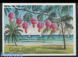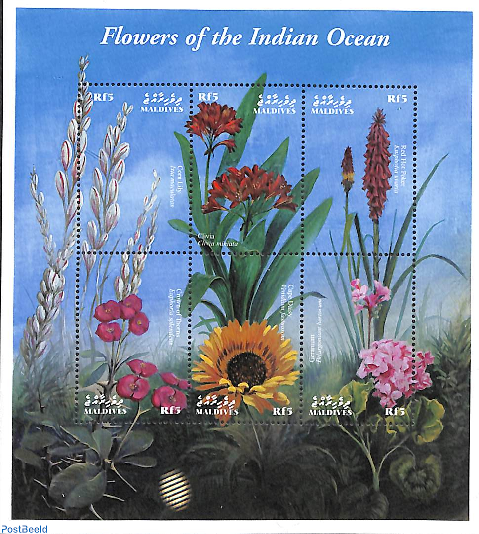 From The Maldives in 1997 we have above the plant Dichrostachys cinerea, also known as sicklebush, Bell mimosa, Chinese lantern tree or, in South Africa the Kalahari Christmas tree. Below two beautifully illustrated stamp sheets from 2000 entitled “Flowers of the Indian Ocean”.