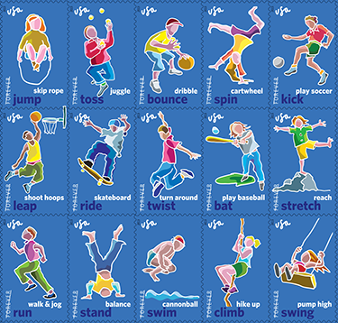 The United States Postal Service (USPS, which is heavily in debt) is destroying an entire run of stamps because the activities illustrated on three of the stamps in the fifteen stamp series have been deemed unsafe by the Presidential Council for Fitness, Sports and Nutrition.