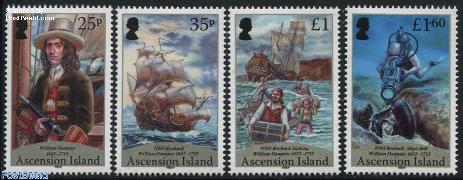 Ascension Island produced a set of stamps in 2015, the 300th anniversary of the death of William Dampier (1651­–1715). His ship, the Roebuck, foundered and sank close to Ascension Island in 1701.