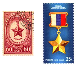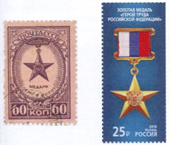 Block. When one compares the USSR heroes and those of the Russian Federation one can conclude that these orders are old, although the ribbons have been changed. The badge of the Gold Star Medal is the same as in the Soviet period, but the star of the Hero of Labour looks different because of the new State Crest instead of the hammer and sickle. The kind of reason for bestowing them is not much changed at all The decorations belonging to the honorary titles (e.g. Honoured Military Navigator of the Russian Federation) are not in the Block and therefore not further mentioned. The system of these honorary titles is the same as that of the Soviet Union.