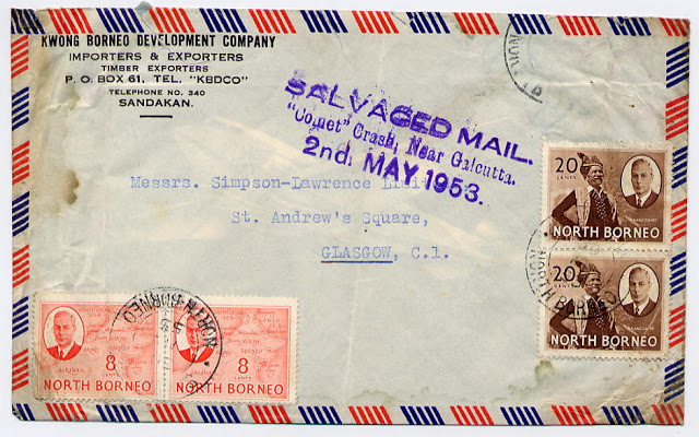 On May 2nd, 1953, a BOAC Comet aircraft (the de Havilland Comet was the world’s first passenger-carrying jet aircraft) with 43 people on board travelling from the Indian city of Calcutta to London crashed 6 minutes after taking off from Calcutta airport due to an ‘exceptionally’ severe tropical storm. There were no survivors but items of mail were recovered (see above) as was the case with the Prestwick accident.