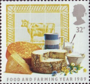 This was part of a 1989 four-stamp set from Great Britain. It shows Stilton, Cheddar and Gloucester cheeses.