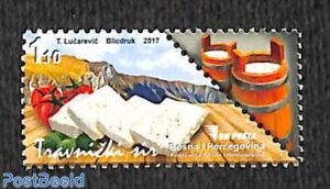 On the 2017 Bosnia and Herzegovina stamp below is Travnik cheese, which boasts a long tradition, produced exclusively in the region of Mount Vlasic. It is produced using local-breed sheep (Pramenka) and cow (Busa) milk, and the rennet is made according to a secret recipe.