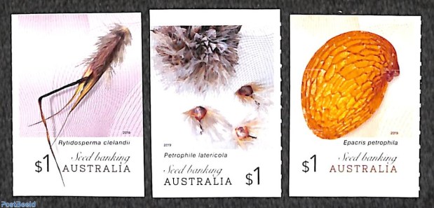 The Australian Seed Bank Partnership draws on the expertise of Australia’s leading botanic gardens, herbaria, state environment agencies and academic institutions, as well as non-government organisations. Its work focuses on securing Australian flora in ex-situ seed collections; enhancing the understanding of seed biology to improve conservation and restoration outcomes; and training and building capacity in Australia for seed science and banking. The ultimate goal is to ensure the survival of Australia’s native plants under present and changing climate and other threats to biodiversity. On the Australian stamps shown here are seeds of three native plant species: Rytidosperma clelandii (a rare, perennial grass from South Australia), Epacris petrophila (a near-threatened alpine shrub from the Australian Alps and high-altitude areas in Victoria and Tasmania) and Petrophile latericola (an endangered shrub from Western Australia).