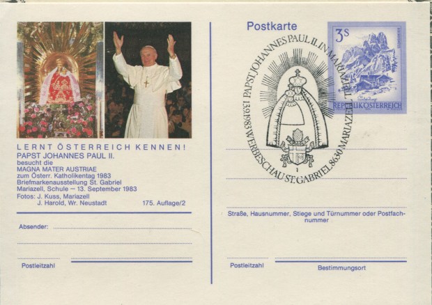 For Pope John Paul II’s visit to Austria in 1983, a postcard with a printed 3 schillings stamp, the ‘Bischofsmütze’, was produced as part of the ‘Get to know Austria’ postcard series. The card depicts the wooden image of the Virgin Mary holding baby Jesus, which is in the Mariazell Basilica, in Mariazell, Austria.