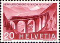 The 20c. marked the 50th Anniversary of the Opening of the Latschberg Railway. This railway was completed on 15th June 1913 with the opening of the Latschberg Tunnel, which took 51 years to build and is 14,605 metres long. This new link to the Simplon line afforded a valuable second railway line traversing the Alps from North to South.