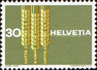 The first 50c. stamp in the set commemorates the Centenary of the Red Cross. Horrified by the carnage at the Battle of Solferino in 1859, part of the Second Italian War of Independence, Henri Dunant – a Swiss businessman, humanitarian and social activist – sought a way to alleviate the suffering of wounded soldiers and civilian population directly affected by warfare and this led to the founding of the Red Cross in 1863. Its emblem was a direct compliment to Dunant, being the reverse of the colours of the Swiss flag. On this occasion, too, a miniature sheet was issued, consisting of a block of 4 stamps based on the design of the Red Cross stamp sold for Fr.3.